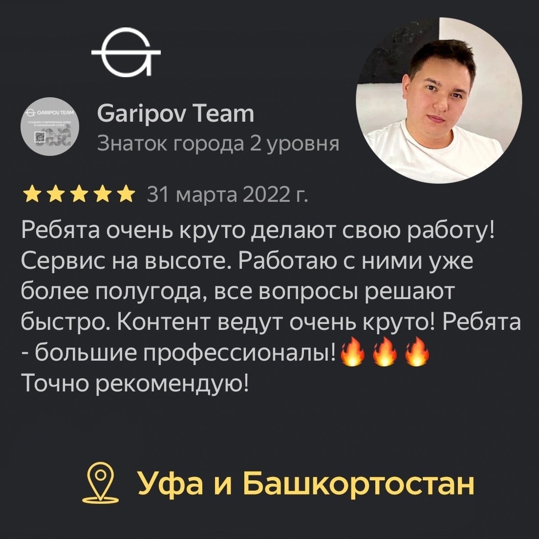 Работаем детально и с перфекционизмом: изучим и погрузимся в ваш бизнес, исследуем ваших конкурентов, целевую аудиторию, проведем даже до заключения договора с вами встречи и мозговые штурмы, постоянно будем на связи в WhatsApp и Telegram. Наш подход оценили и остаются довольными результатами такие бренды как Mercedes-Benz, World Class, радио Европа+, Арт-КВАДРАТ, холдинг Башкирский Кирпич, ПроМедицина, санаторий Янган-Тау, Ювелирцентр, ЖК Выбор первых. Давайте обсудим и ваши задачи!